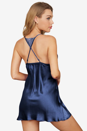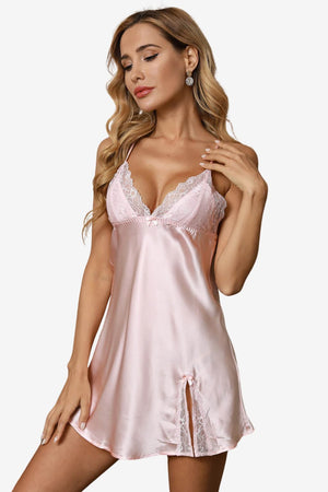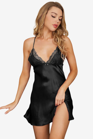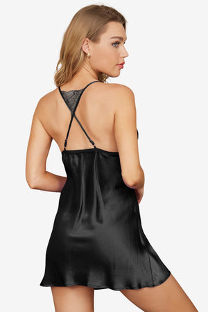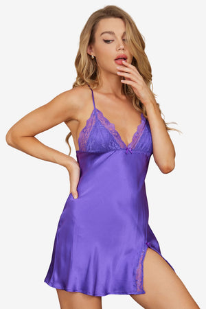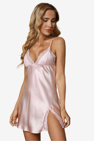 This Women's V-Neck Nightgown with Lace Trim is a lightweight slip dress designed for lounging or sleepwear. Its glossy, smooth texture and white lace accents create a balanced appearance, suitable for women seeking a functional nightgown or loungewear option for home use, with a mid-thigh cut for ease of movement.- Adjustable Straps: Thin straps allow for a customizable fit.