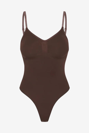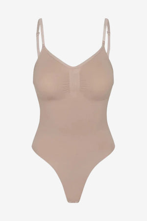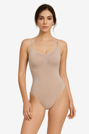 This women’s seamless bodysuit provides full torso coverage in a single-piece format suitable for wear beneath closely fitted clothing. Designed with thin, length-adjustable straps and a lowered neckline, it supports a closer fit across different body shapes. The smooth surface and flexible construction make it appropriate for use as a low-profile layering garment.- Adjustable shoulder straps: Thin straps can be modified in length to support varied proportions and layering needs.