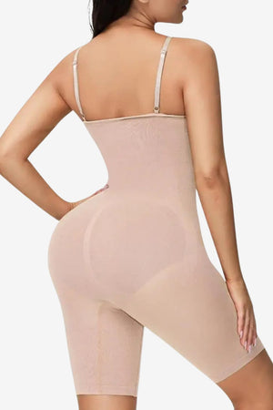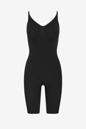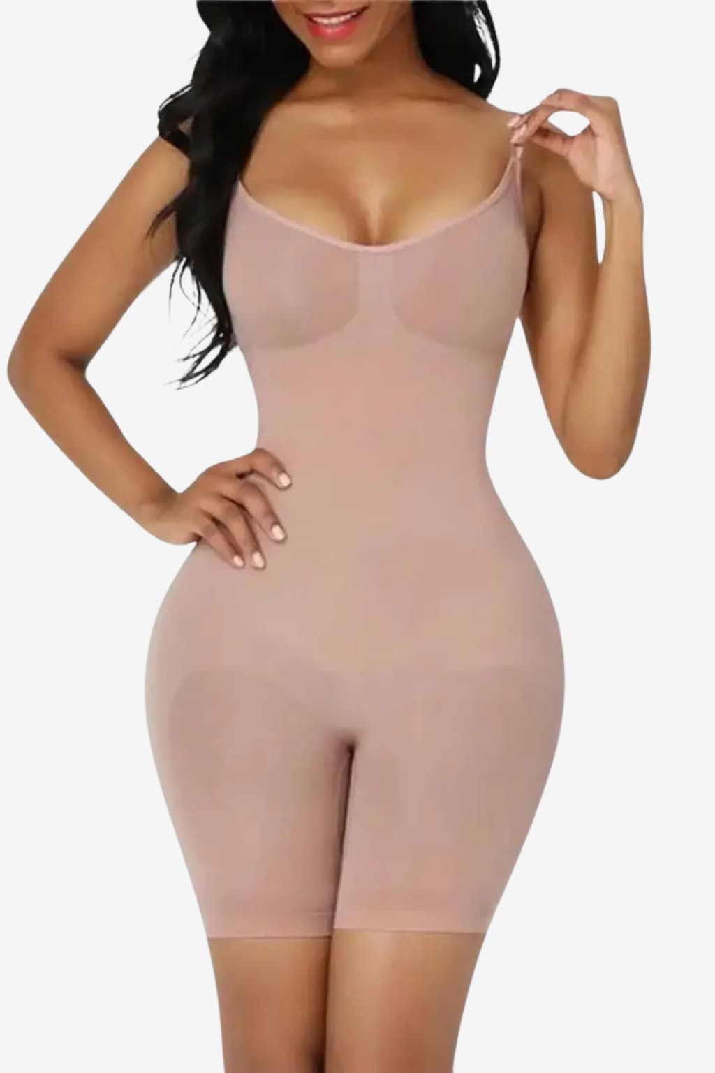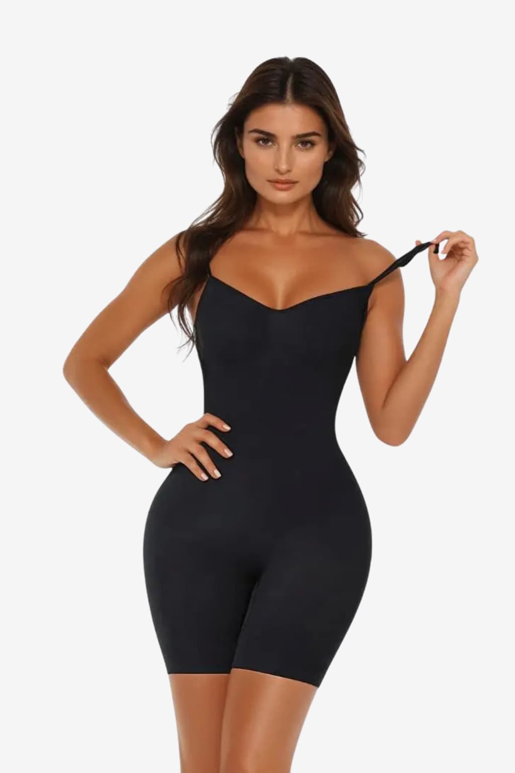 The Women's Seamless V-Neck Body Contouring Bodysuit is a sleeveless shapewear garment with mid-thigh length. Its stretchy, seamless material provides a smooth fit, suitable for women seeking a contoured silhouette under various outfits for daily wear or special occasions.- Fitted Design: Shapes the torso, waist, hips, and thighs effectively.