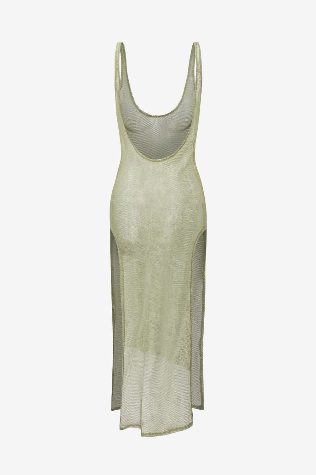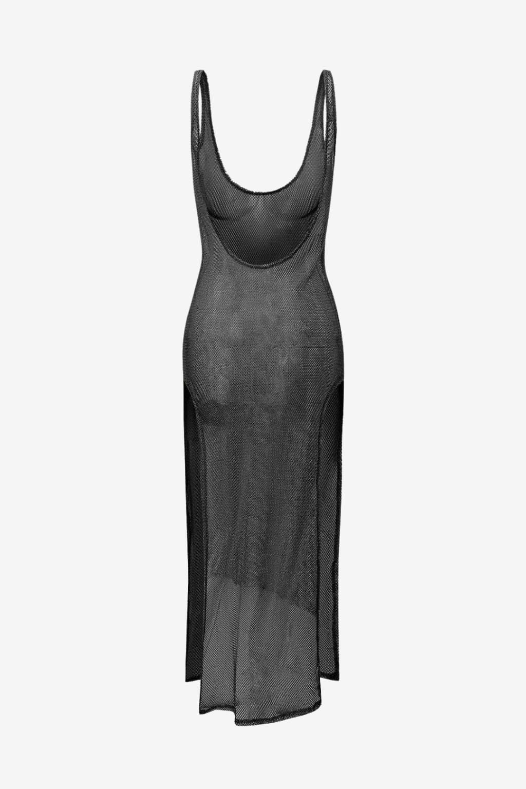 The Women's Sheer Mesh Midi Cover-Up Dress is a sleeveless, fitted garment with a scoop neckline and an asymmetrical hem. Made from lightweight, stretchy mesh fabric, it serves as a versatile layering piece for women during vacation or casual settings, offering a semi-transparent look with a fitted silhouette.- Fitted Silhouette: Tailored shape suits various body types.