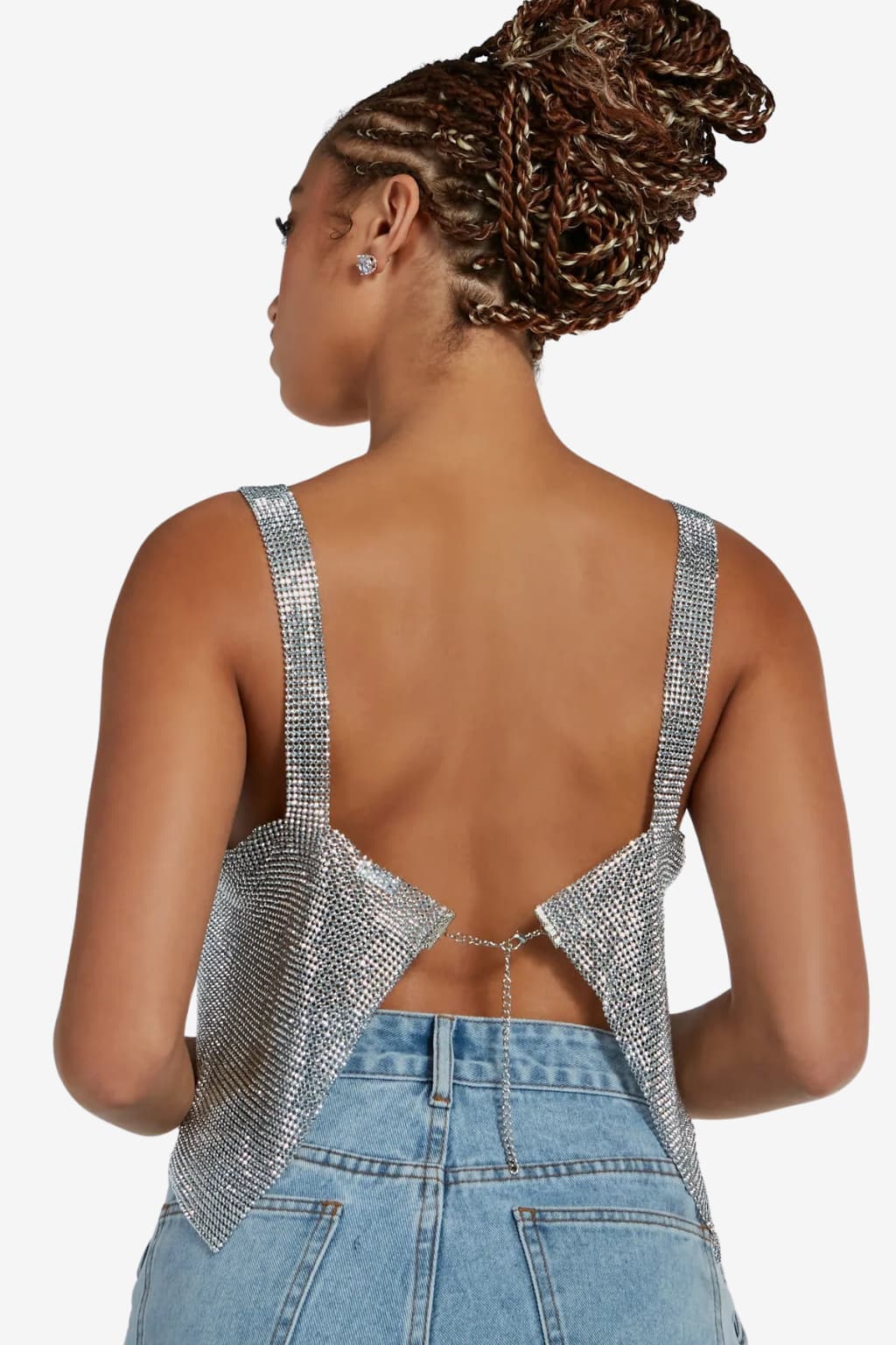 This women’s sleeveless crop top features a reflective, textured surface and defined structure intended for use in party, festival, or nightlife settings. Its cropped format and linked surface provide a visually prominent shape, while the open-back design and adjustable chain strap contribute to a customized fit. Developed for those seeking a structured garment with visual contrast.- Sleeveless turtleneck shape: Features a raised neckline with open shoulders, creating a structured and minimal outline.
