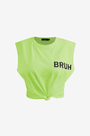 The Women's Sleeveless Cropped T-Shirt with Bruh Print features a bold neon green color and a playful "BRUH" print. Its low-stretch fabric and fitted silhouette suit women seeking a trendy option for warm weather and relaxed settings. The design emphasizes a structured look for casual wear.- Fitted Silhouette: Cropped length and snug fit suit various body shapes.