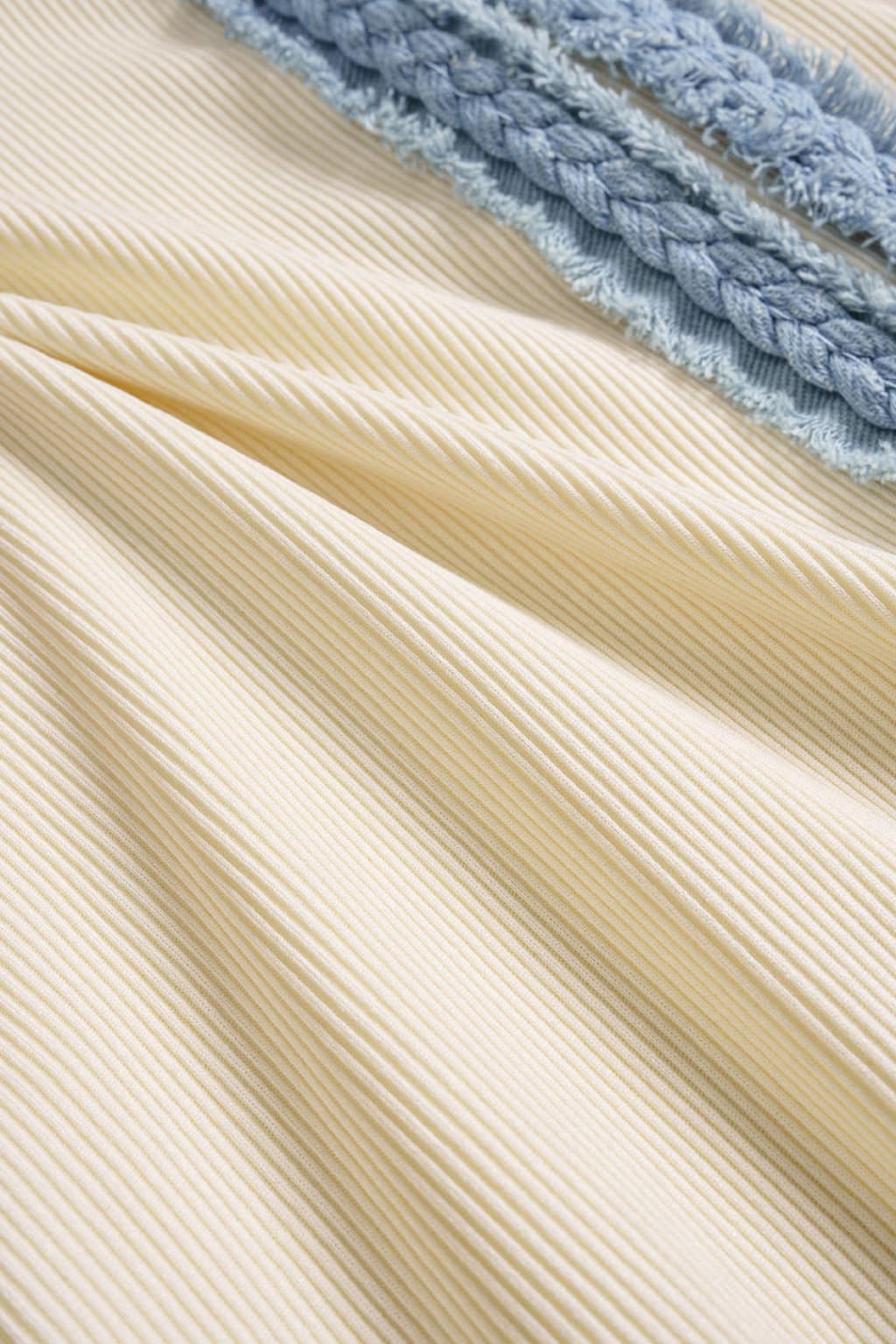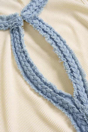 - Textured Edges: Frayed trim on center and neckline adds unique detailing.