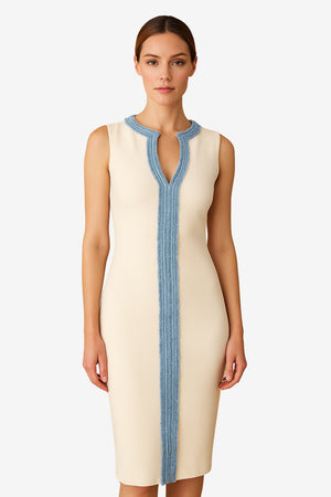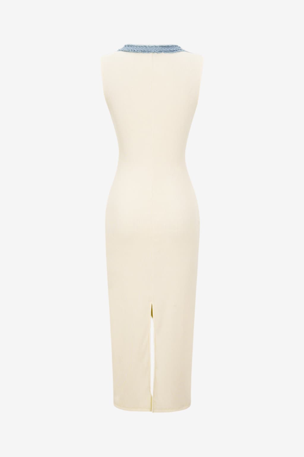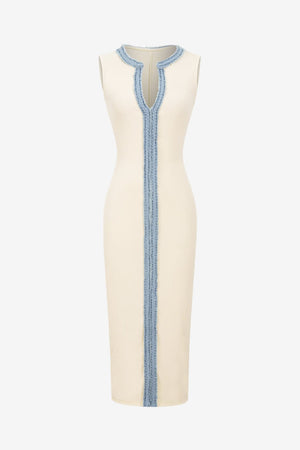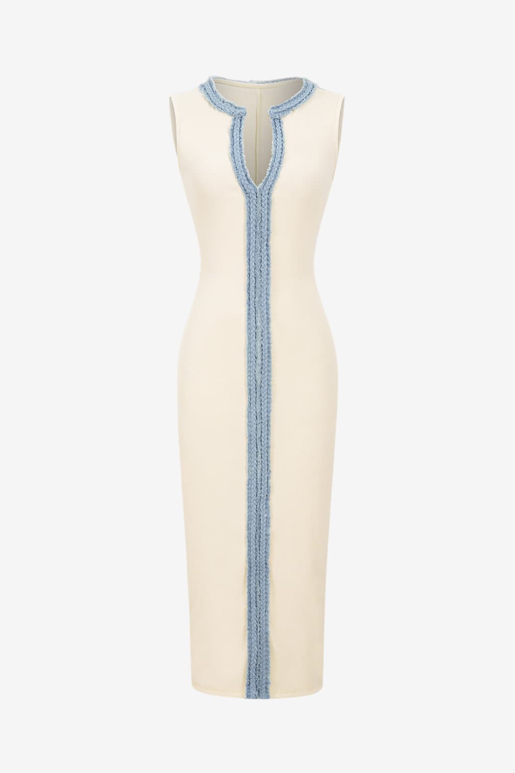 The Women's Sleeveless Maxi Dress features a slim-fit, V-neck design for casual wear. Its medium-weight, stretchable fabric and fitted silhouette suit women seeking a structured style. The dress includes textured edges and contrast trim for added detail, ideal for everyday- Slim Fit: Bodycon silhouette follows the body's contours for a fitted look.