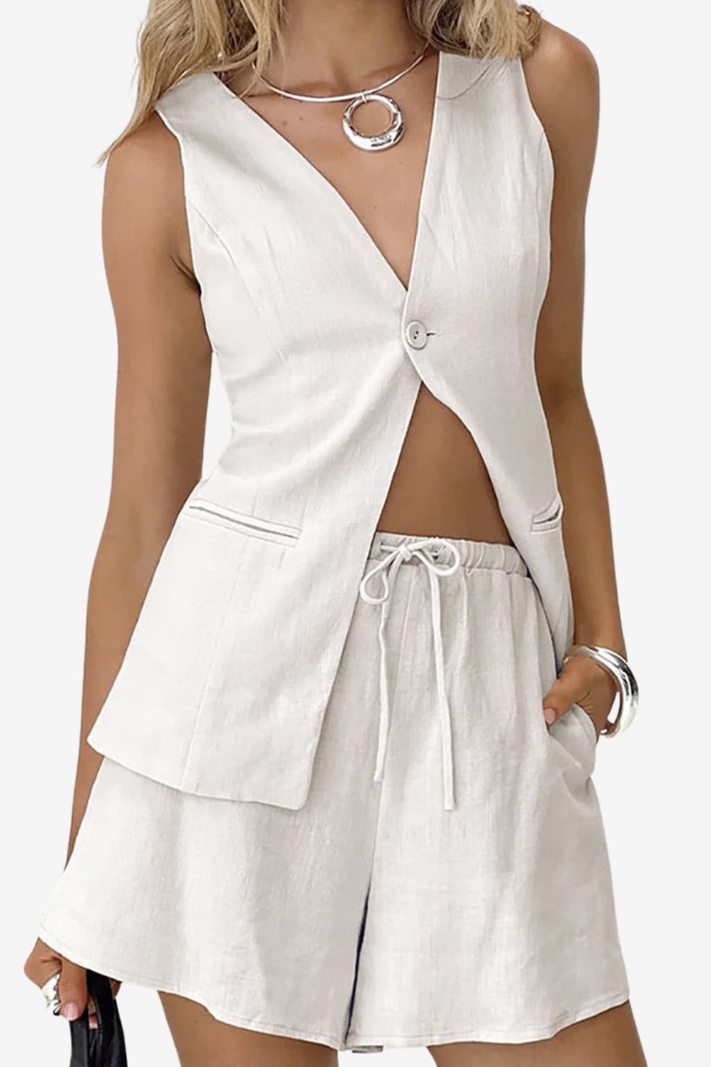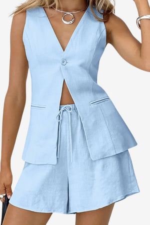This sleeveless two-piece set includes a V-neck vest top and relaxed-fit shorts. Built with a focus on structure and seasonal adaptability, the set provides a defined upper cut and a shaped lower silhouette. The drawstring waistband and front button add functional detailing while maintaining a uniform profile.- Sleeveless top with V-neck: Vest-style neckline with a front-facing open cut designed for simplified layering.