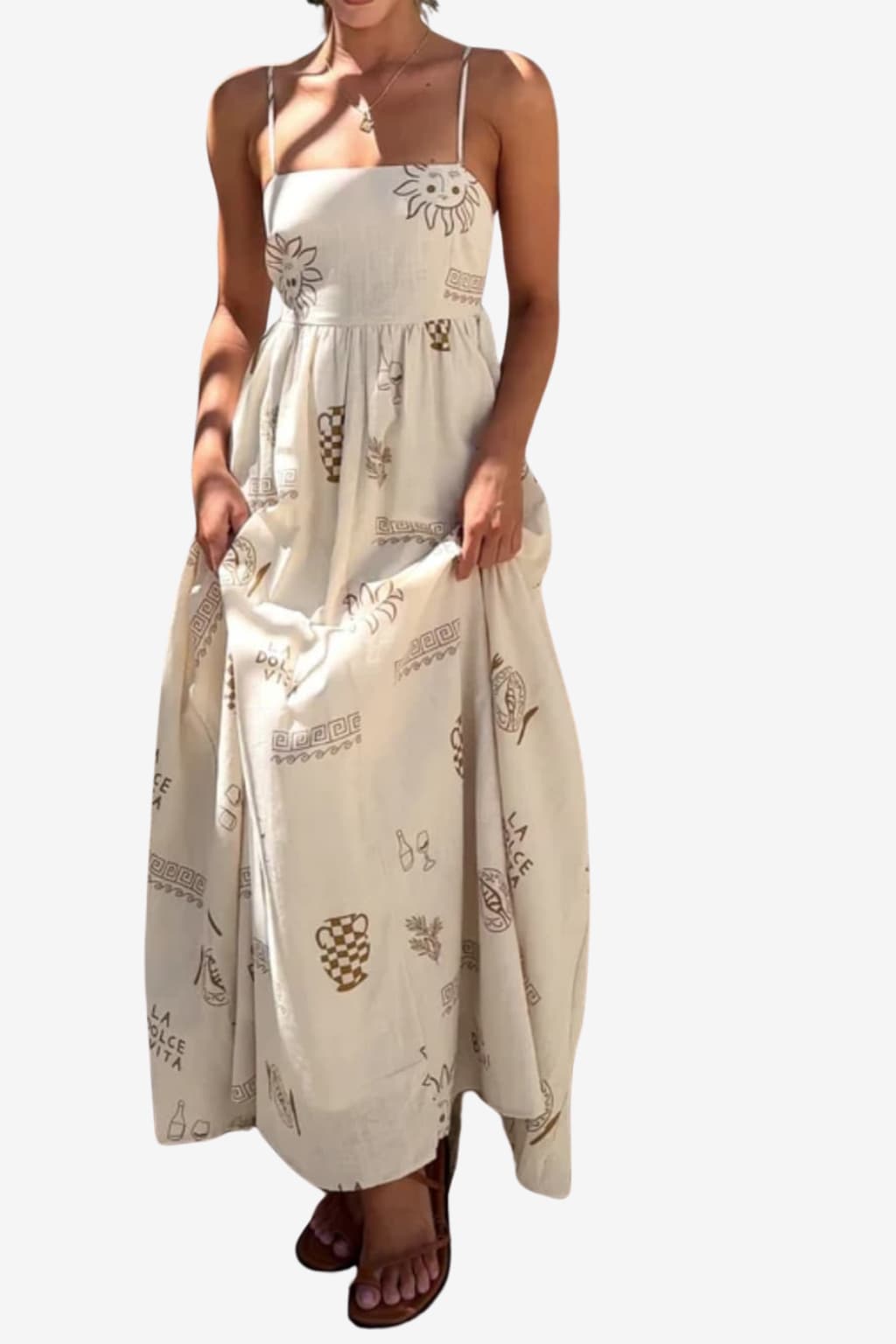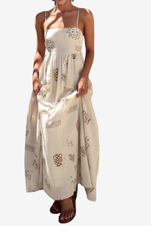 This ankle-length dress features a straight neckline and slim shoulder straps, forming a clean and structured outline suitable for warm-weather settings. It pairs a fitted upper portion with a gently widened skirt, supported by neutral tones and artistic surface detailing.- Straight neckline with thin straps: Features a linear upper edge and narrow straps to define the shoulder area with minimal coverage.
