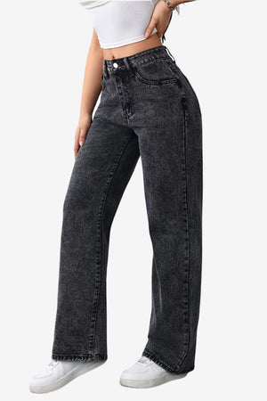 These women’s straight-leg jeans feature a wide fit through the hips and thighs with a high-rise waist for a full-length appearance. Designed with subtle texture and practical pocket layout, the jeans offer a stable form with adaptable styling options. Suitable for those who prefer a wide-leg shape with consistent structure across daily wear.- Loose straight-leg fit: Provides a consistent width from hip to ankle, allowing for movement without close contact to the body.