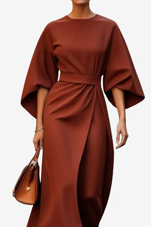This strapless dress includes a fitted upper section and gathered sleeve details, forming a consistent shape throughout the design. The dress features a structured bodice and matching belt that aligns at the waist for outline definition. Vertical seams and soft shaping in the lower section provide a balanced visual flow.- Strapless bodice structure: Upper panel constructed with shaping seams for a contoured fit around the torso.