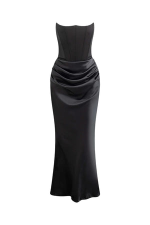 This strapless mermaid-style maxi dress features a tapered structure that closely follows the body's shape before widening toward the hem. Made with a smooth-surfaced fabric and a shaped bodice, it is intended for formal settings where a clear outline and minimal surface detail are preferred. Designed for wearers looking for a gown with a stable form and limited stretch.- Strapless bodice construction: Includes vertical seams and a close-fit shape that remains in place without the use of straps, outlining the upper body and neckline.
