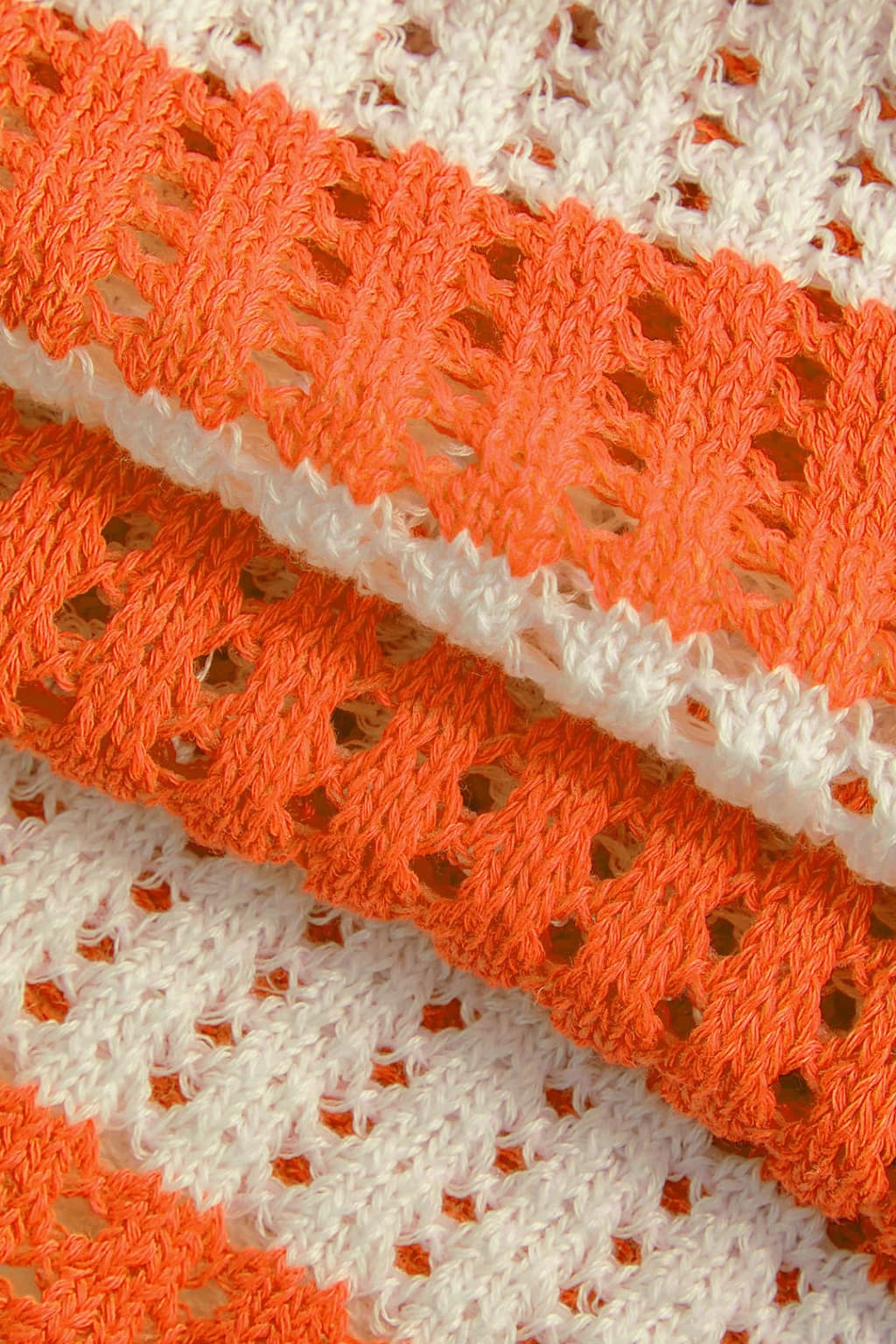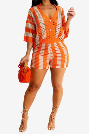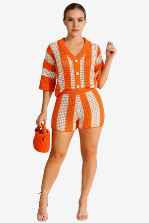 This two-piece striped knit set includes a collared top with front tie detail and matching high-waisted shorts. The design features a semi-sheer surface with a relaxed profile suitable for warm-weather wear. Presented with alternating orange and cream stripes, the set maintains continuity across both pieces.- Loose-fit top with tie-front closure: A V-neck, button-down top featuring a tie detail at the hem for adjustable presentation.