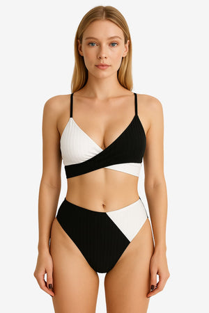 This summer bikini set includes a ribbed wrap-style top with thin straps and back ties, combined with high-waisted bottoms in a matching tone. Designed with visual consistency in mind, the top includes a V-shaped neckline and layered construction, while the bottom provides defined waist coverage and a structured silhouette.- Adjustable back-tie top: Wrap-style top with thin straps and rear ties for customizable alignment.
