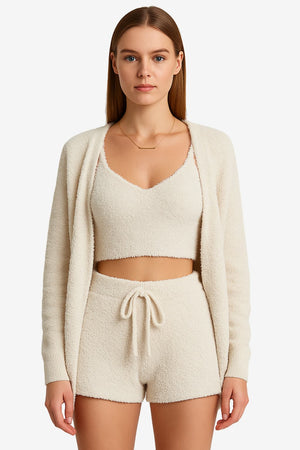 This loungewear set includes a sleeveless V-neck crop top, high-waisted shorts, and an open-front cardigan. Each piece is shaped to offer ease of movement and consistent structure. Developed for indoor settings, the set presents a uniform surface texture and a layered option suitable for cooler environments.- Three-piece coordination: Includes a sleeveless crop top, relaxed-fit shorts, and a long-sleeved cardigan, designed for interchangeable wear and indoor use.