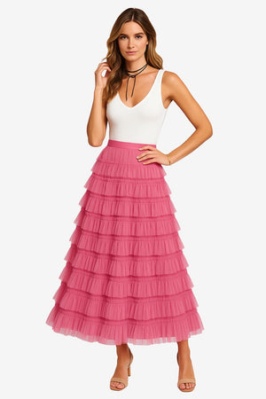 This women’s tiered maxi skirt features a defined high-waist fit and layered construction that creates a measured outline. Designed for both informal and semi-formal settings, it presents a full-length profile with gathered tiers that add volume while maintaining a lightweight structure. Its shaped form is suited for individuals seeking a fitted waist and extended length.- Tiered, layered construction: Multiple gathered sections contribute to the overall form and texture, extending through the full length of the skirt.
