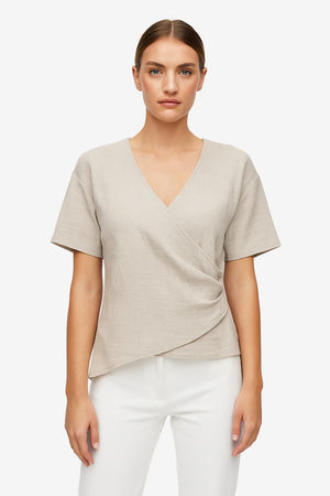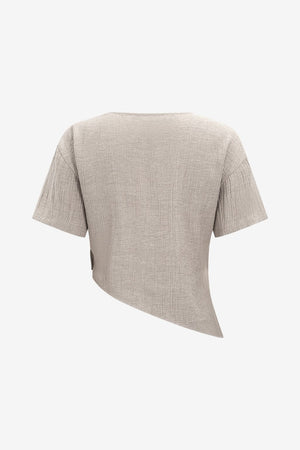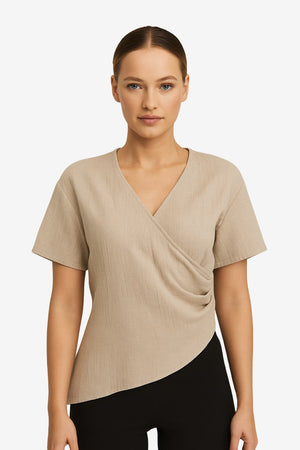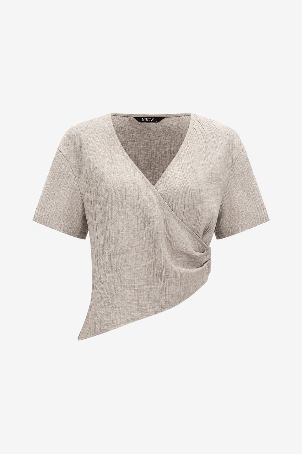 The Women's V-Neck Wrap Short Sleeve Top features a loose-fitting design with textured, lightweight fabric. Its wrap closure and asymmetrical hem offer a modern silhouette, suitable for women seeking a relaxed, everyday garment for various occasions.- Loose Fit: Relaxed shape fits various body types.