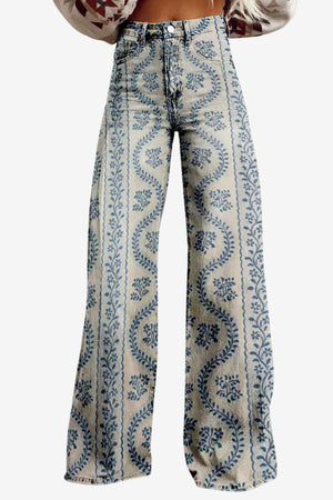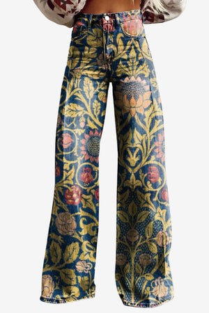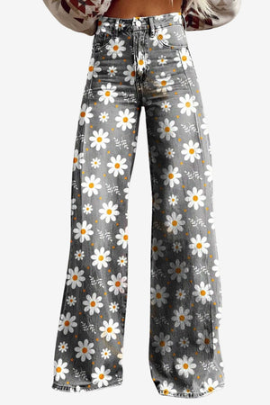 Women's Vintage Daisy Print Wide-Leg Trousers High-Waisted