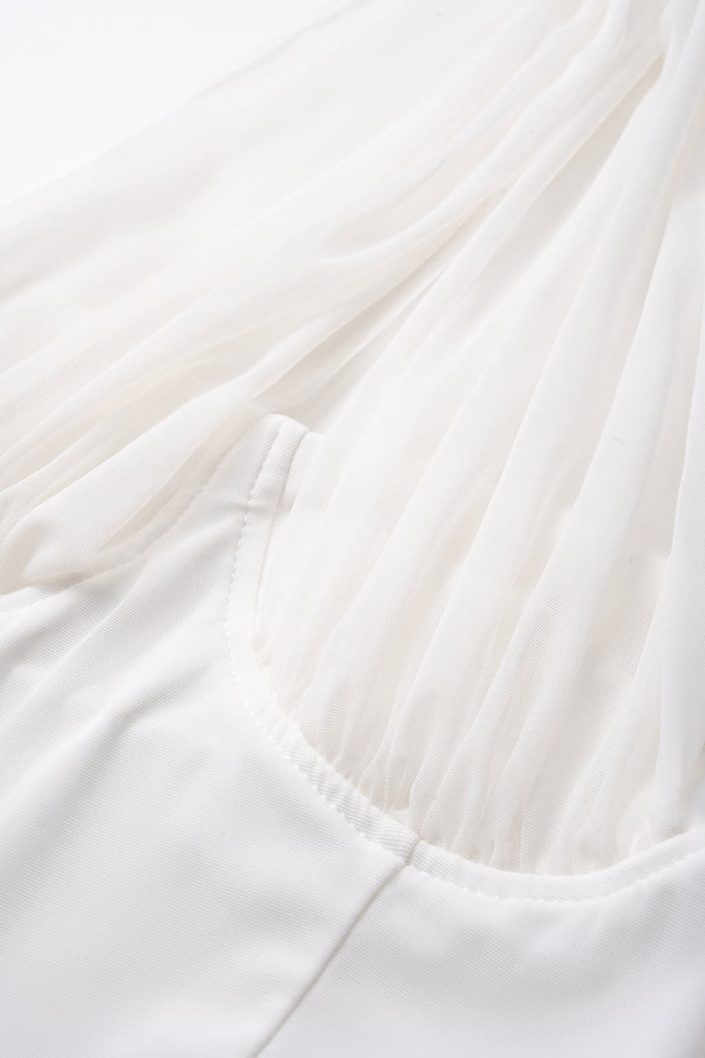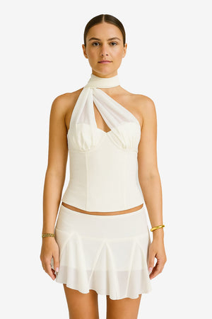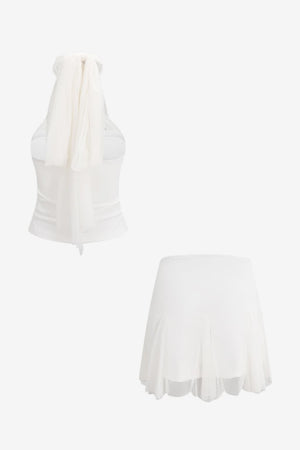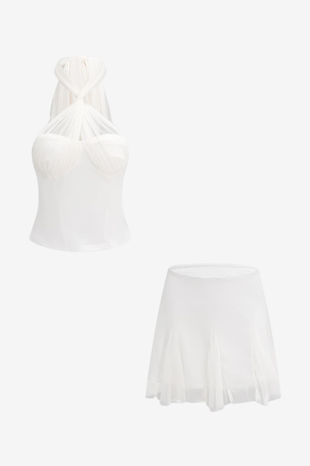 Women's White Mesh Halter Top & Pleated Skirt Set
