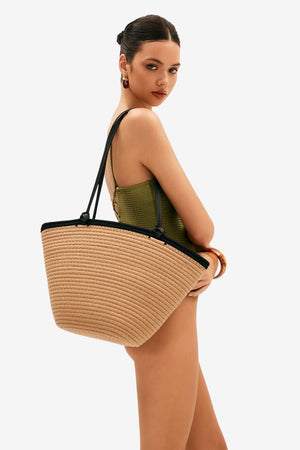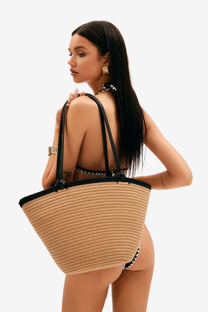 This straw-style tote bag features a spacious interior and defined trapezoidal shape. Built for daily use in warm-weather settings, the design includes dual straps and a consistent surface texture. Its neutral tones and large compartment support practical functionality for carrying personal items.- Wide trapezoidal shape: Maintains its structure when filled, offering a defined profile suitable for varied contents.